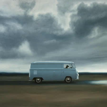 Black Lab with VW Bus and Dramatic Sky -SOLD